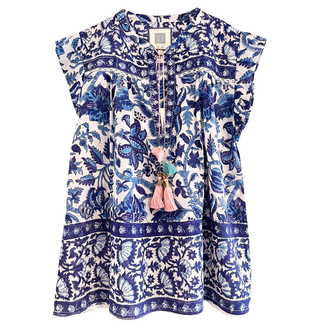 Silk cotton voile hand block sleeveless top with tassel detailing and split neckline