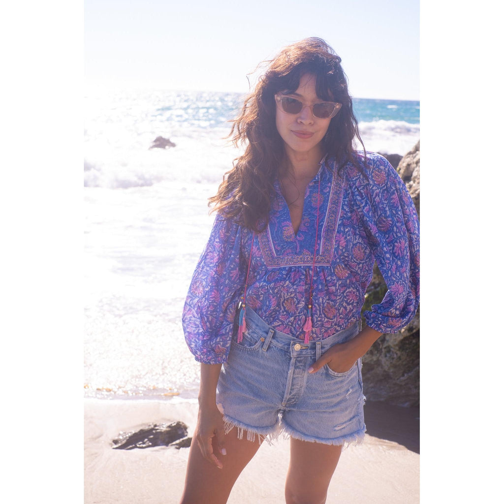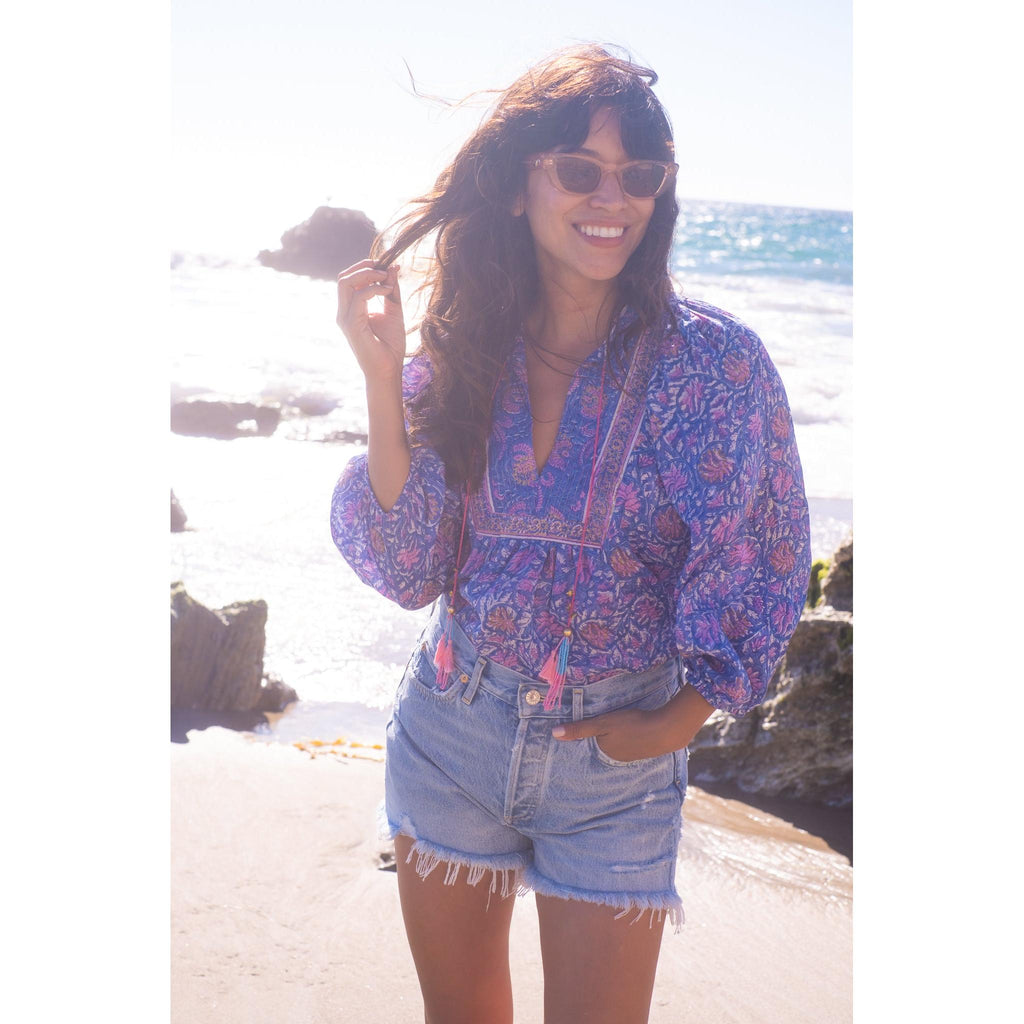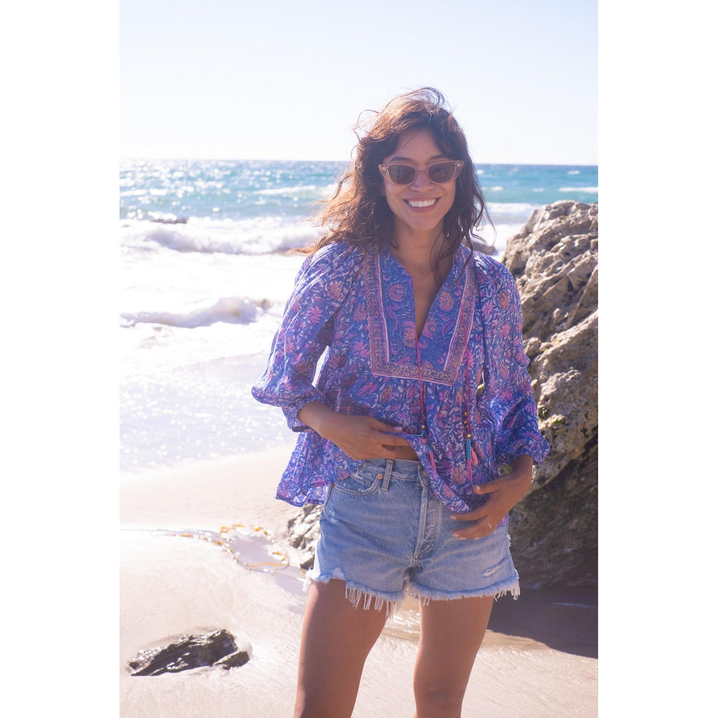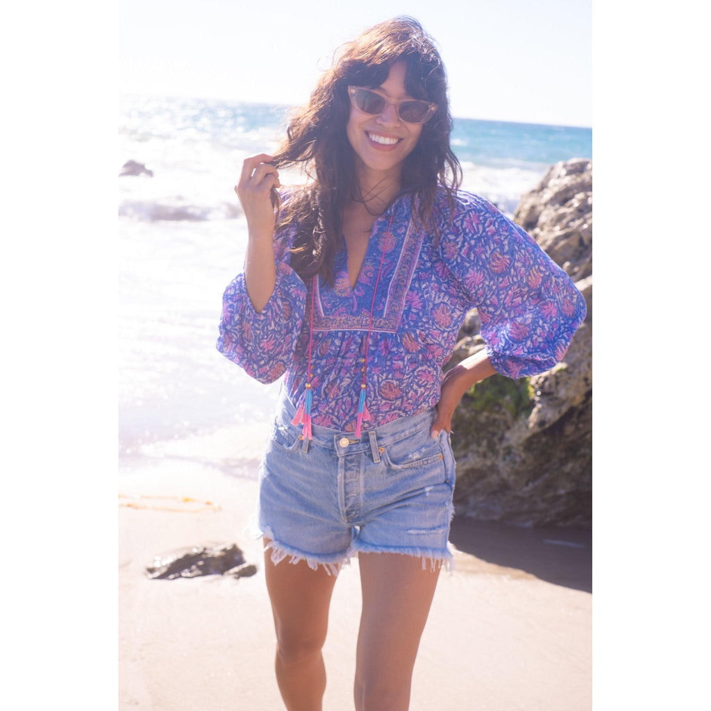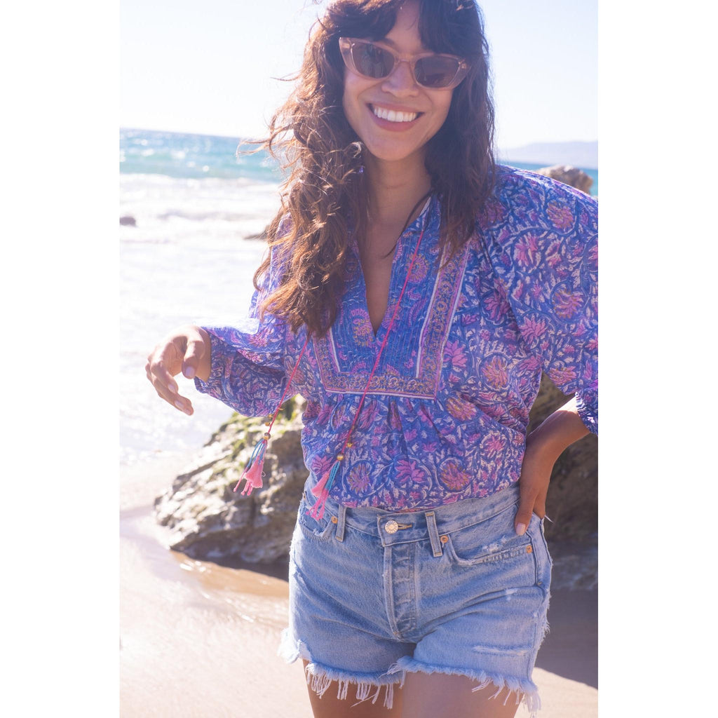 Macey Top $265.00 size XS XS S M L XL XS S M L XL Add to Cart This item is a recurring or deferred purchase. By continuing, I agree to the cancellation policy and authorize you to charge my payment method at the prices, frequency and dates listed on this page until my order is fulfilled or I cancel, if permitted. A buttery soft rayon tencel fabric printed long sleeve top with tassel tie neckline