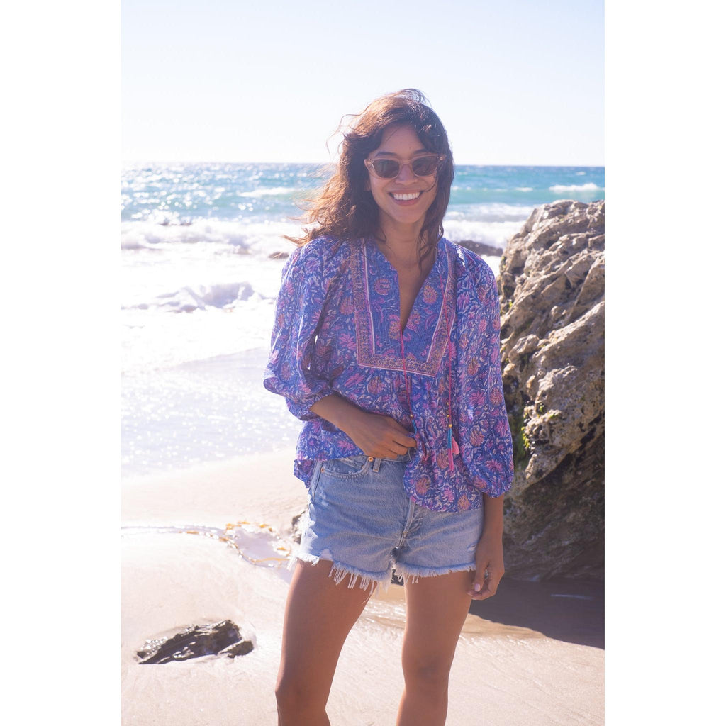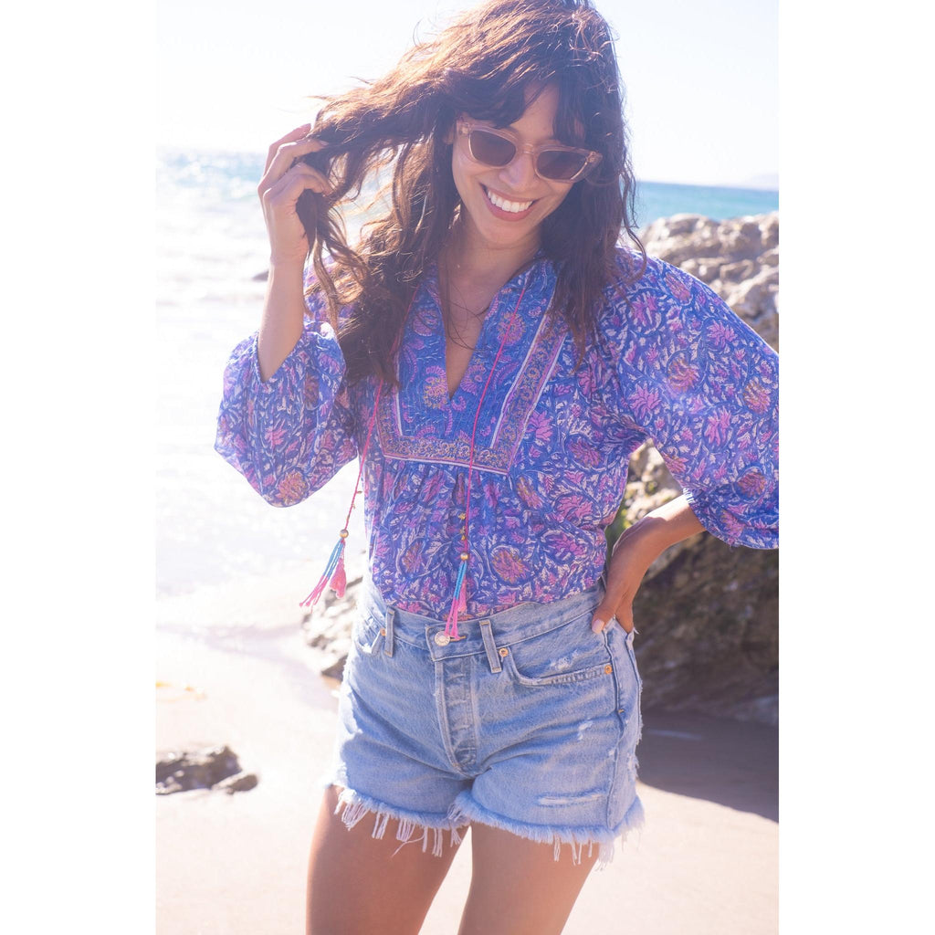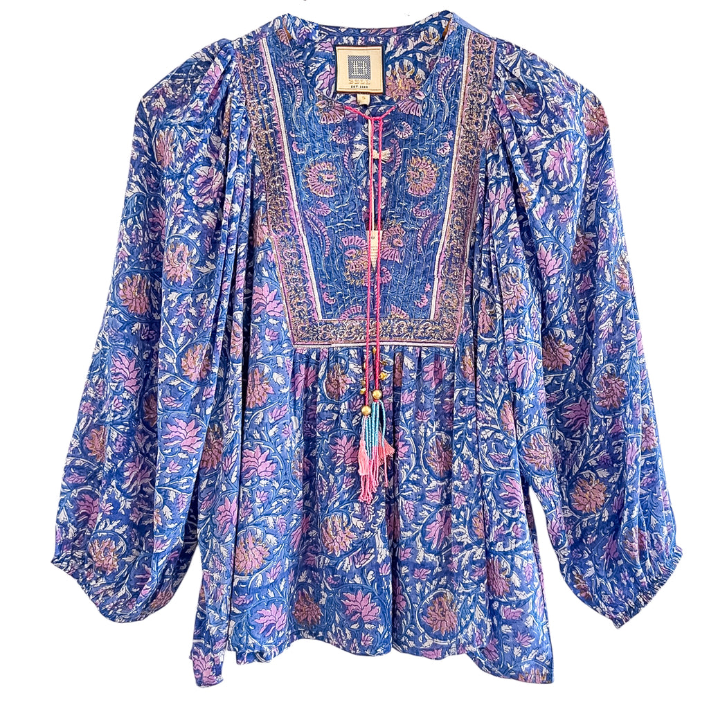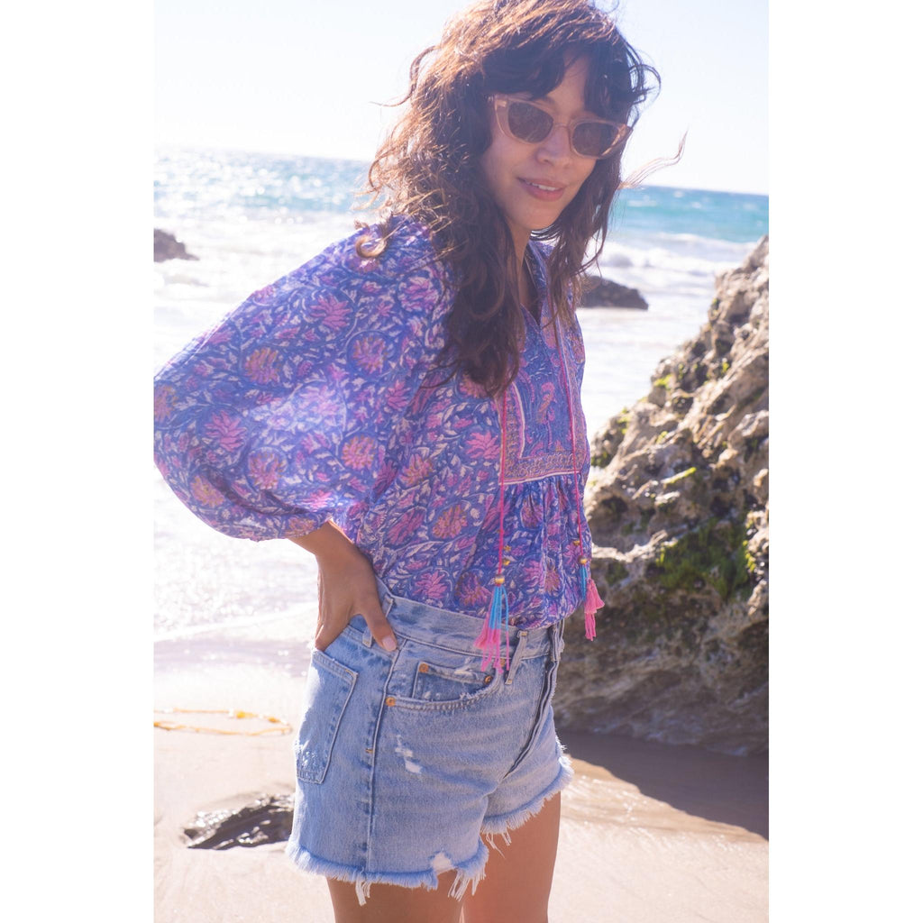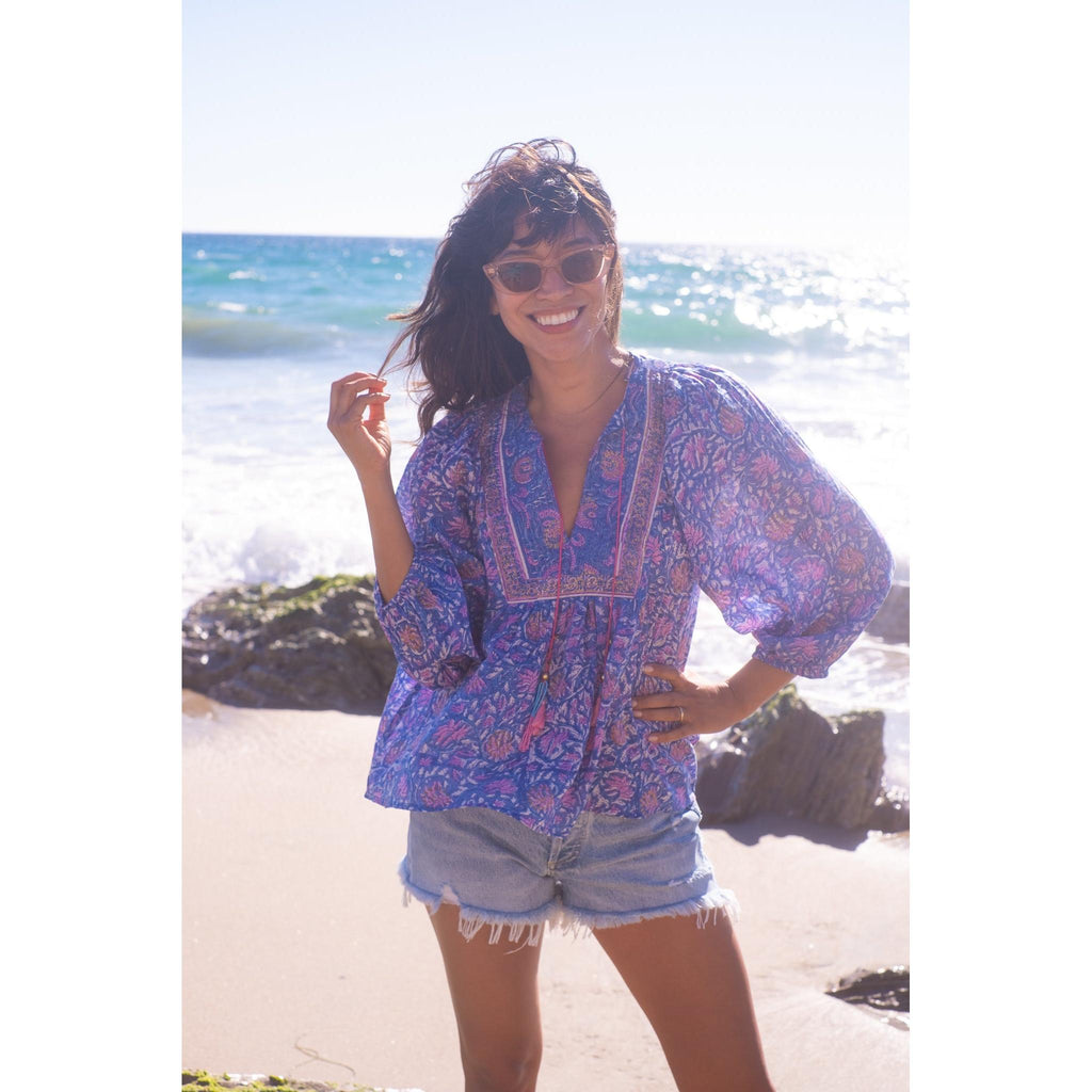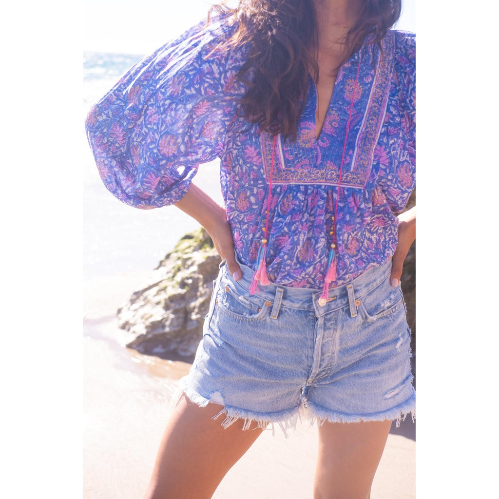 Macey Top $265.00 size XS XS S M L XL XS S M L XL Add to Cart This item is a recurring or deferred purchase. By continuing, I agree to the cancellation policy and authorize you to charge my payment method at the prices, frequency and dates listed on this page until my order is fulfilled or I cancel, if permitted. A buttery soft rayon tencel fabric printed long sleeve top with tassel tie neckline
