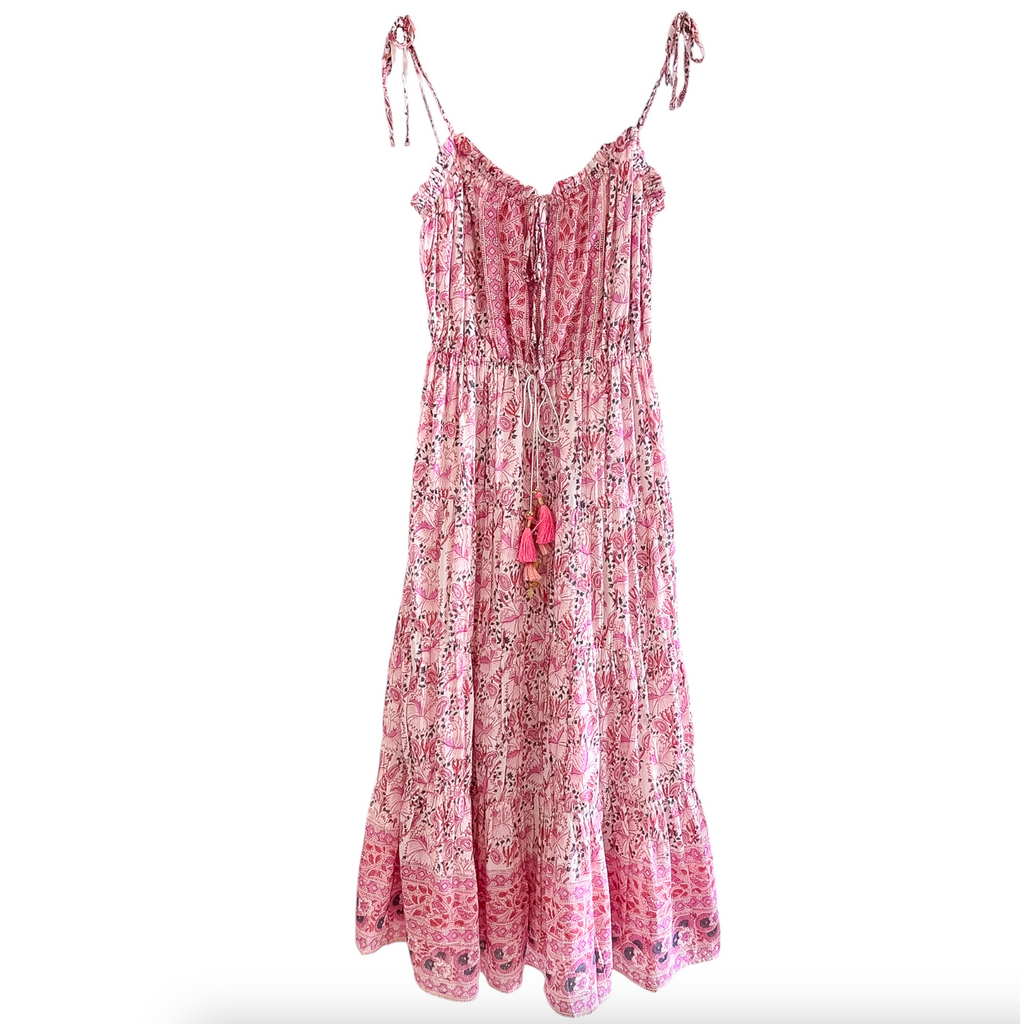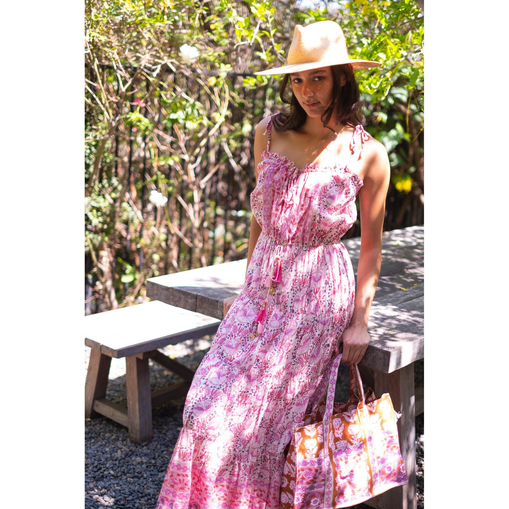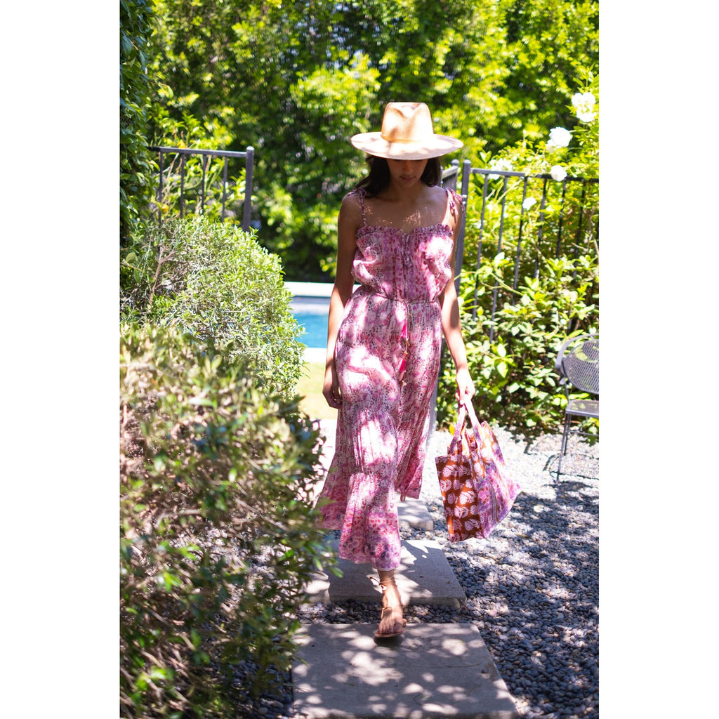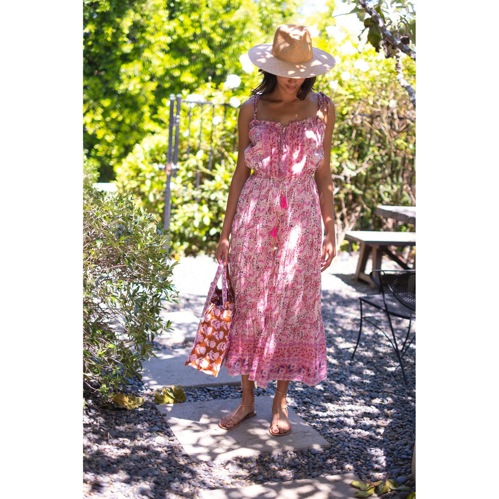 Holiday Midi Dress - Preorder $381.00 size XS XS S M L XL XS S M L XL Add to Cart This item is a recurring or deferred purchase. By continuing, I agree to the cancellation policy and authorize you to charge my payment method at the prices, frequency and dates listed on this page until my order is fulfilled or I cancel, if permitted. Silk cotton voile hand blocked midi dress with tie neckline, bow tie straps, and drawstring waist