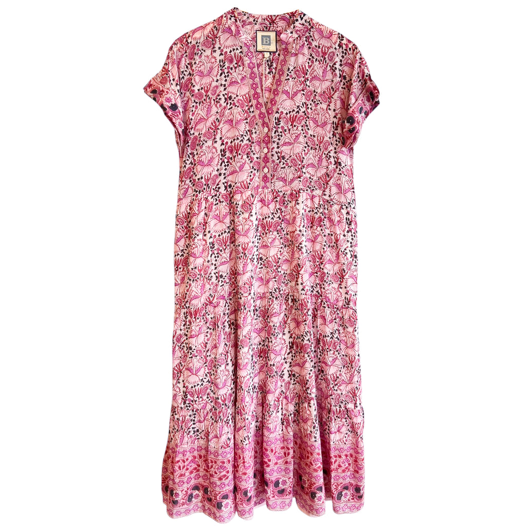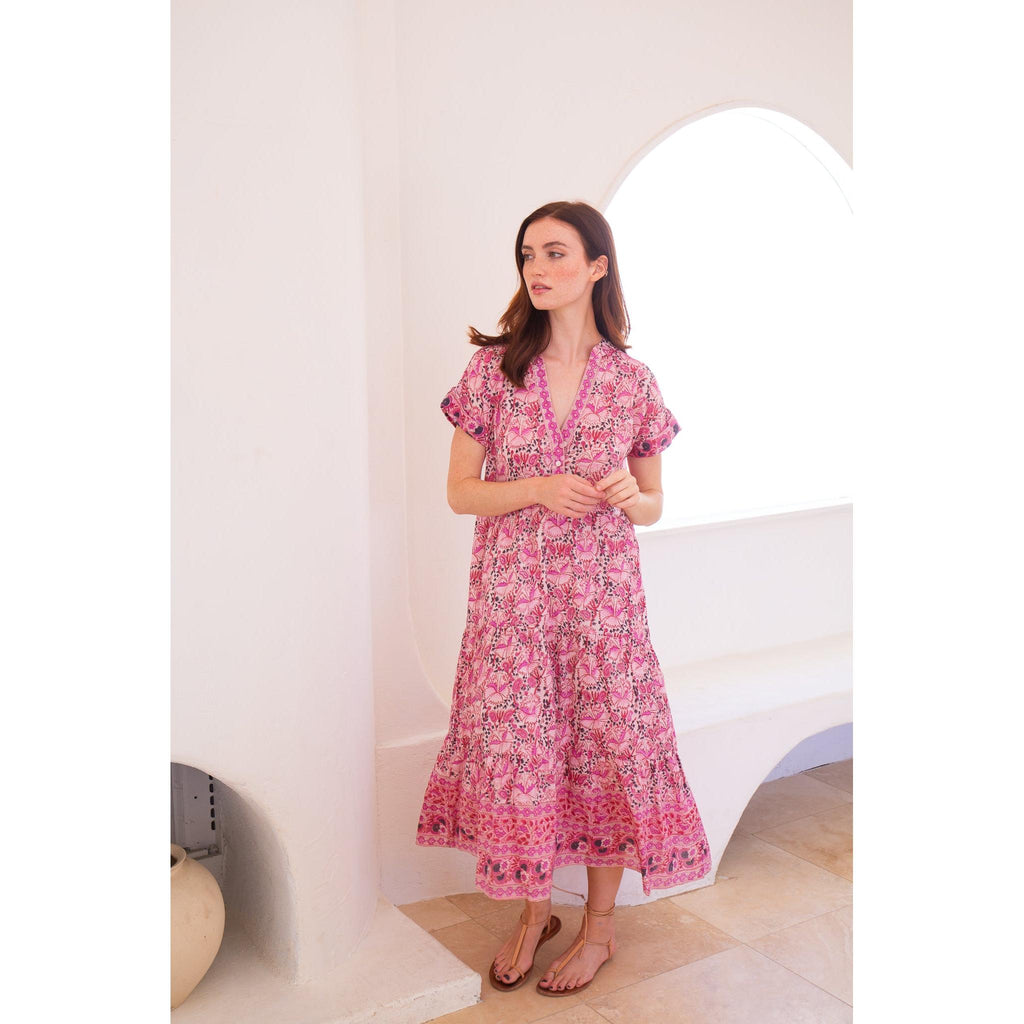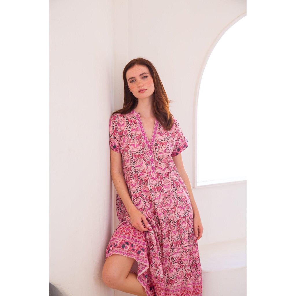 Kat Midi Dress - Preorder $402.00 size XS XS S M L XL XS S M L XL Add to Cart This item is a recurring or deferred purchase. By continuing, I agree to the cancellation policy and authorize you to charge my payment method at the prices, frequency and dates listed on this page until my order is fulfilled or I cancel, if permitted. Silk cotton voile hand blocked midi dress with button up v neckline and short sleeves with cuff detailing
