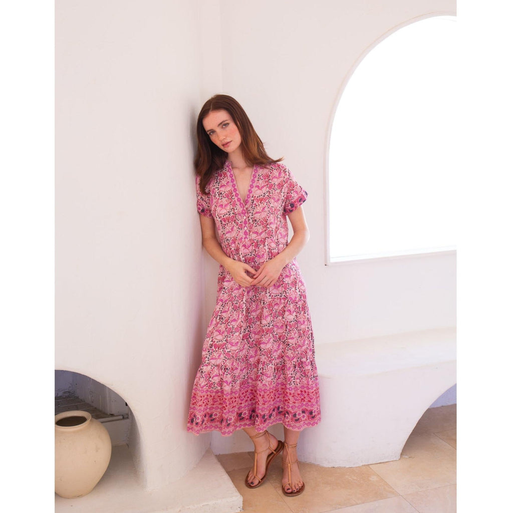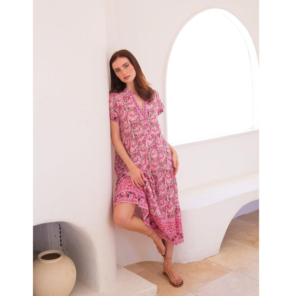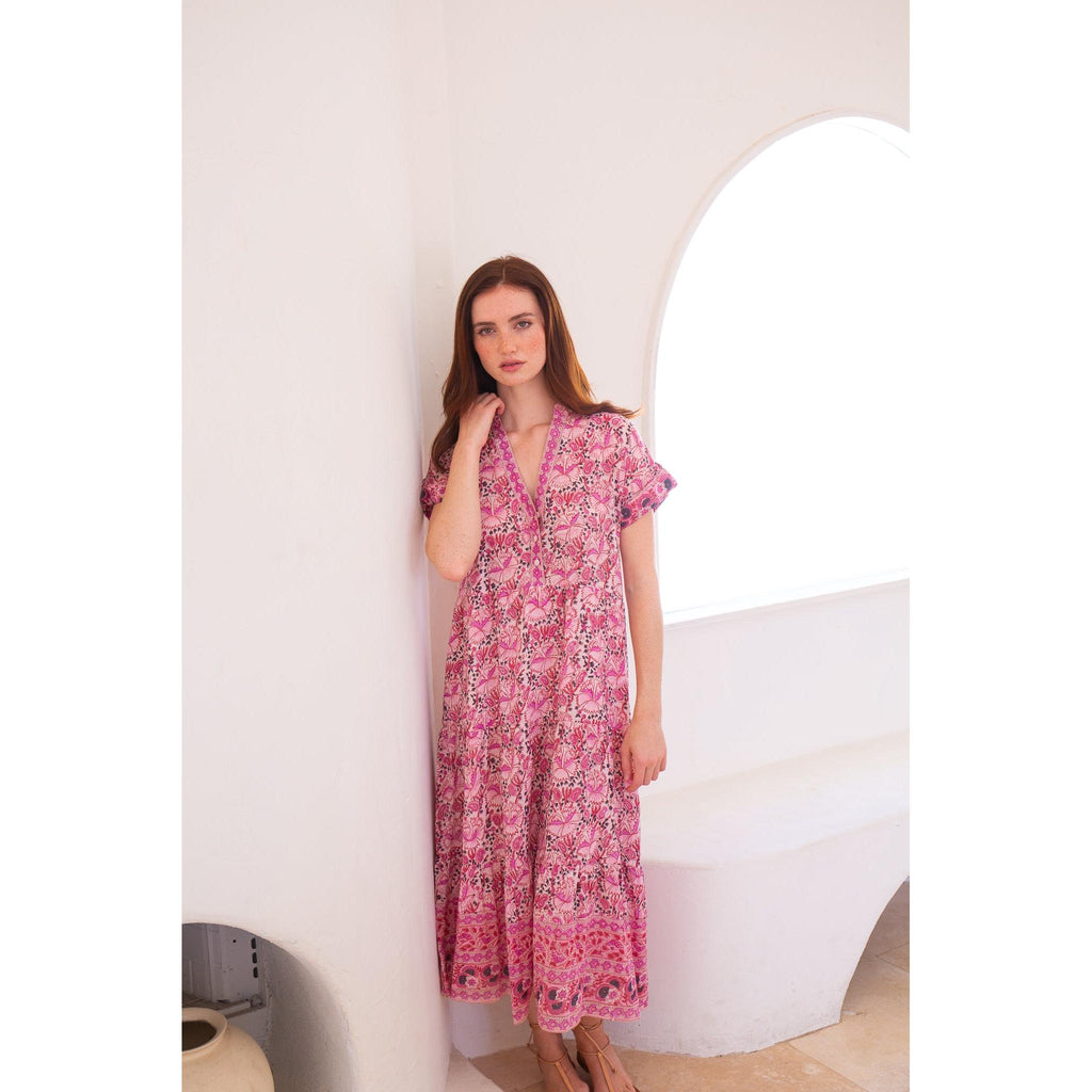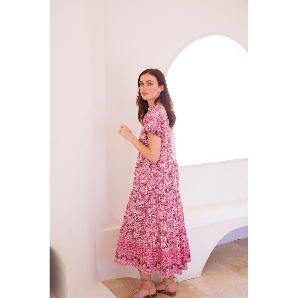 Kat Midi Dress - Preorder $402.00 size XS XS S M L XL XS S M L XL Add to Cart This item is a recurring or deferred purchase. By continuing, I agree to the cancellation policy and authorize you to charge my payment method at the prices, frequency and dates listed on this page until my order is fulfilled or I cancel, if permitted. Silk cotton voile hand blocked midi dress with button up v neckline and short sleeves with cuff detailing