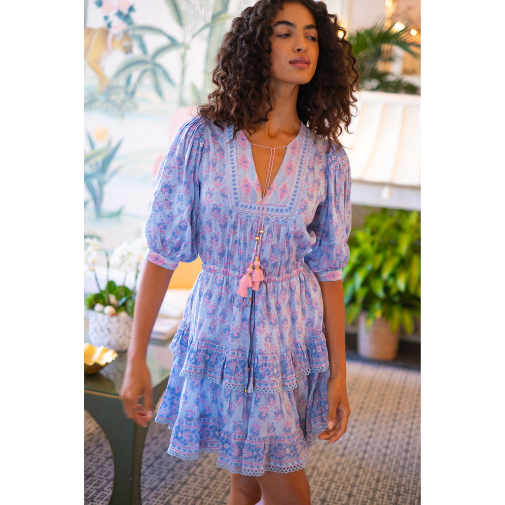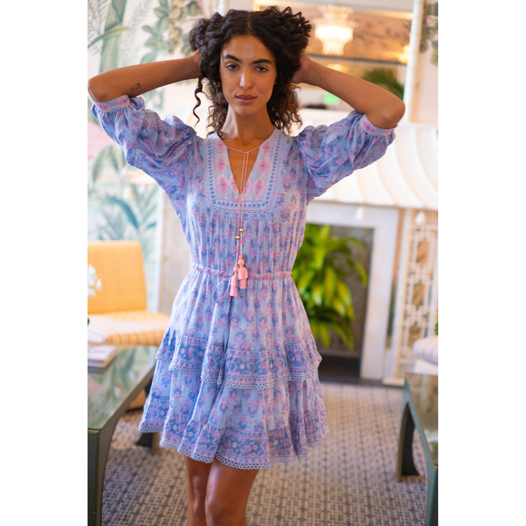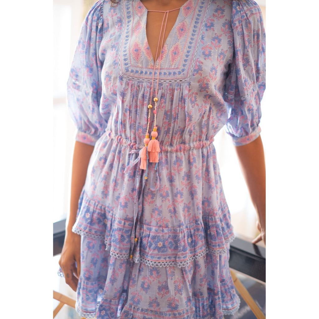 Silk cotton voile hand blocked mini dress with tassel tie neckline and tiered skirt