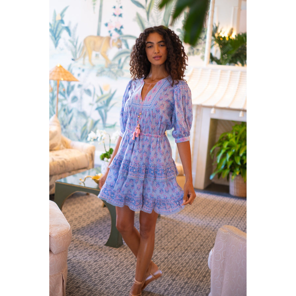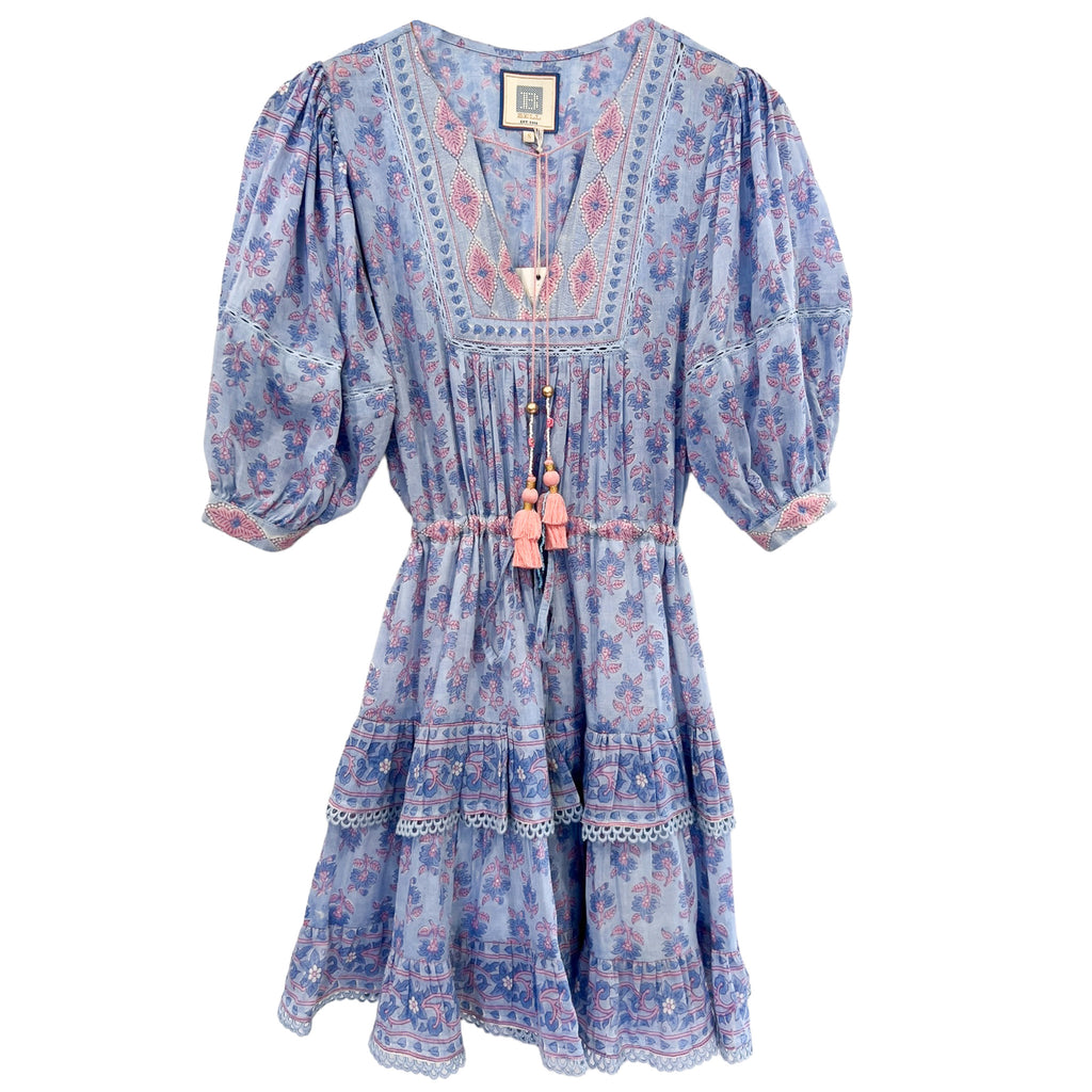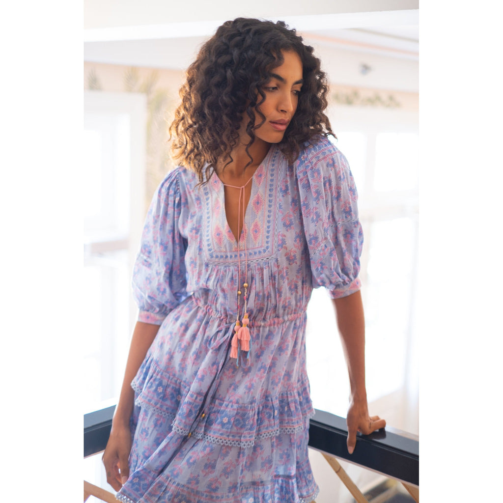 Silk cotton voile hand blocked mini dress with tassel tie neckline and tiered skirt