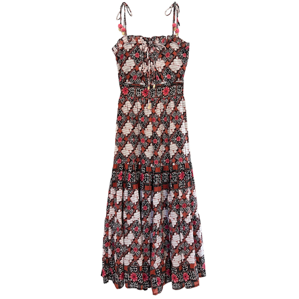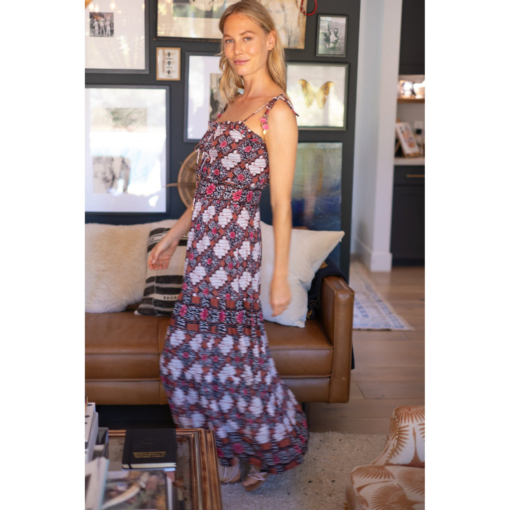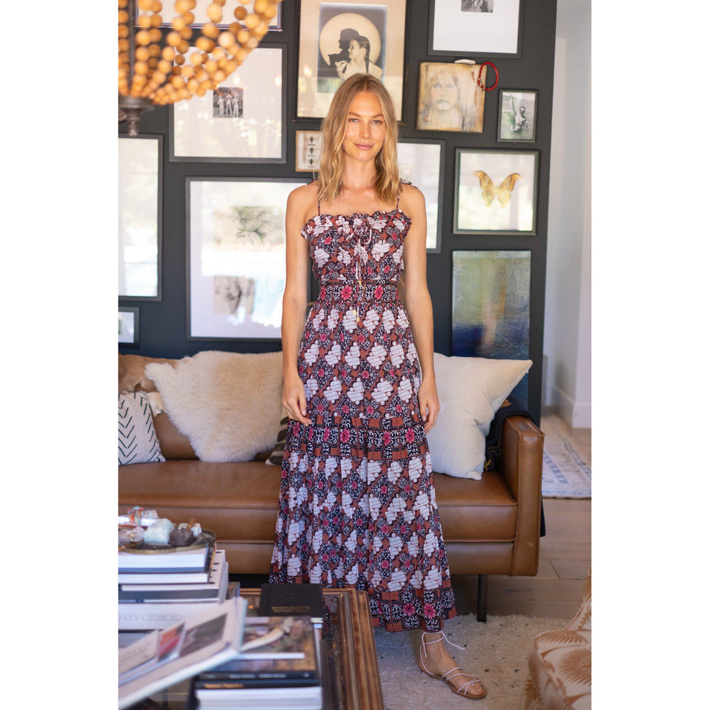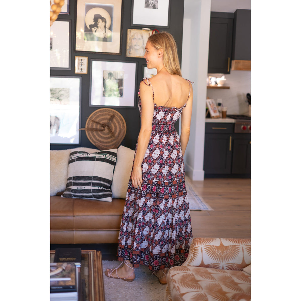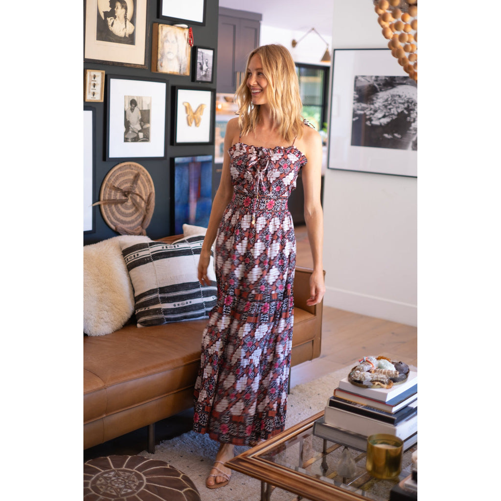 Silk cotton voile hand block tie spaghetti strap maxi dress with bow detailing