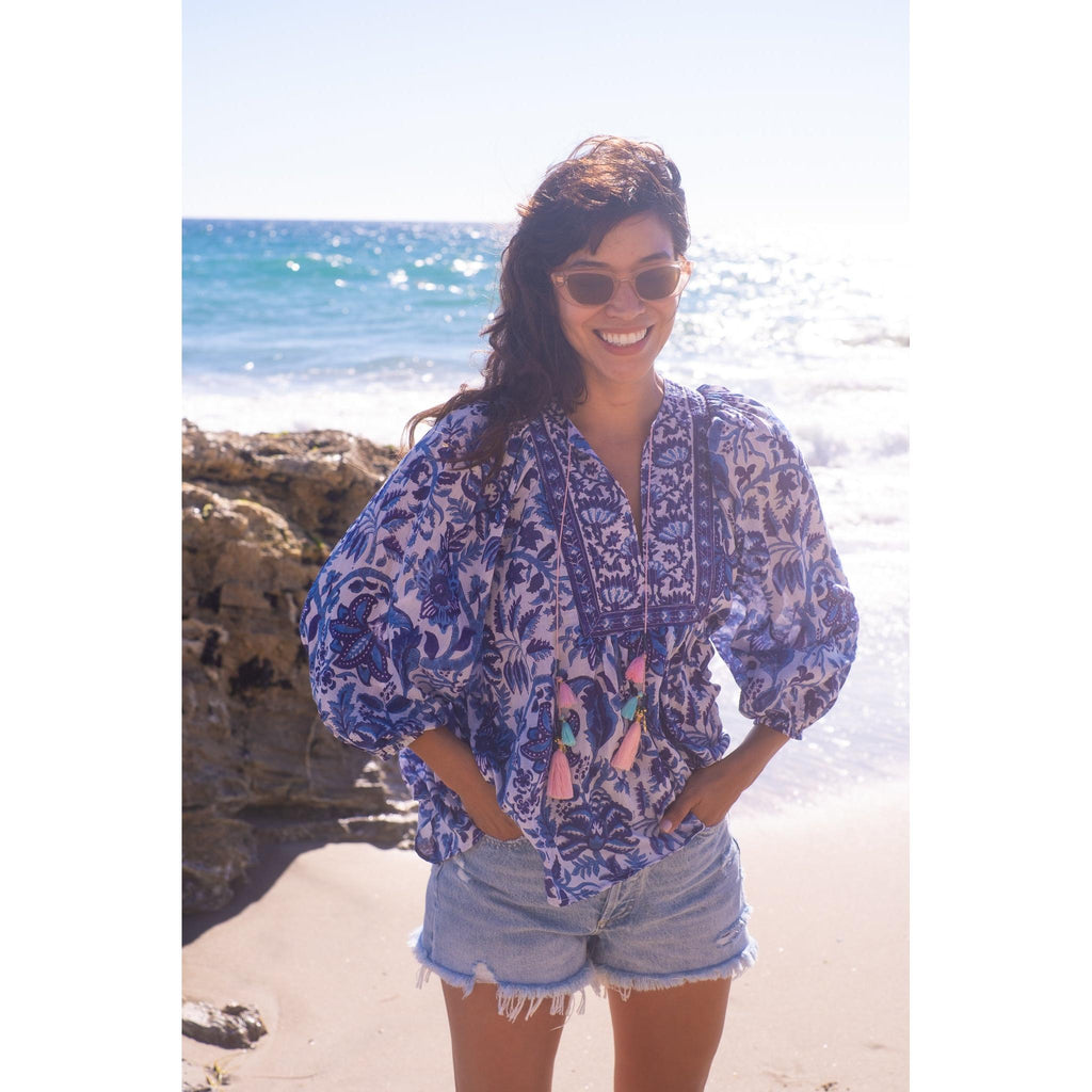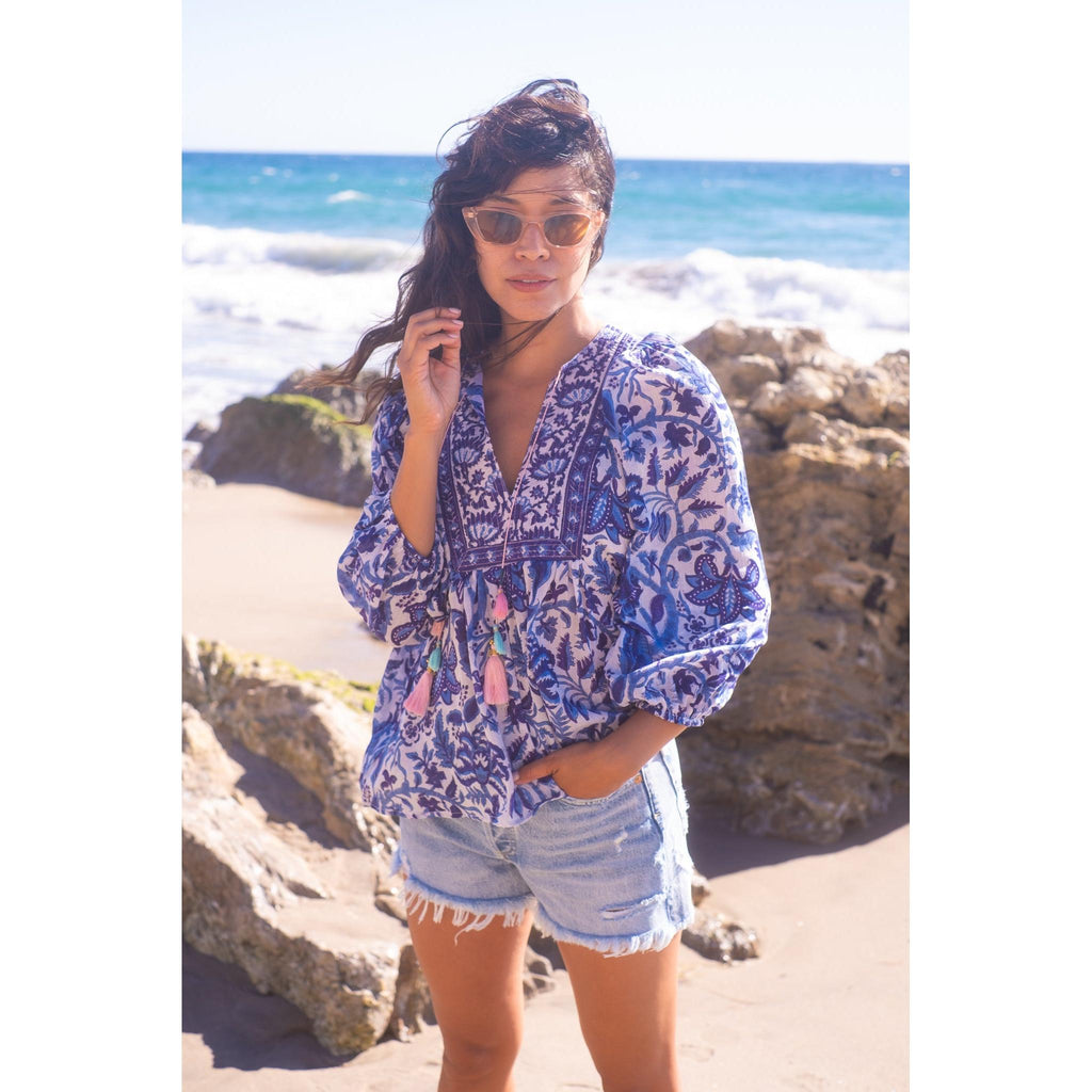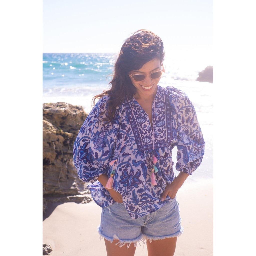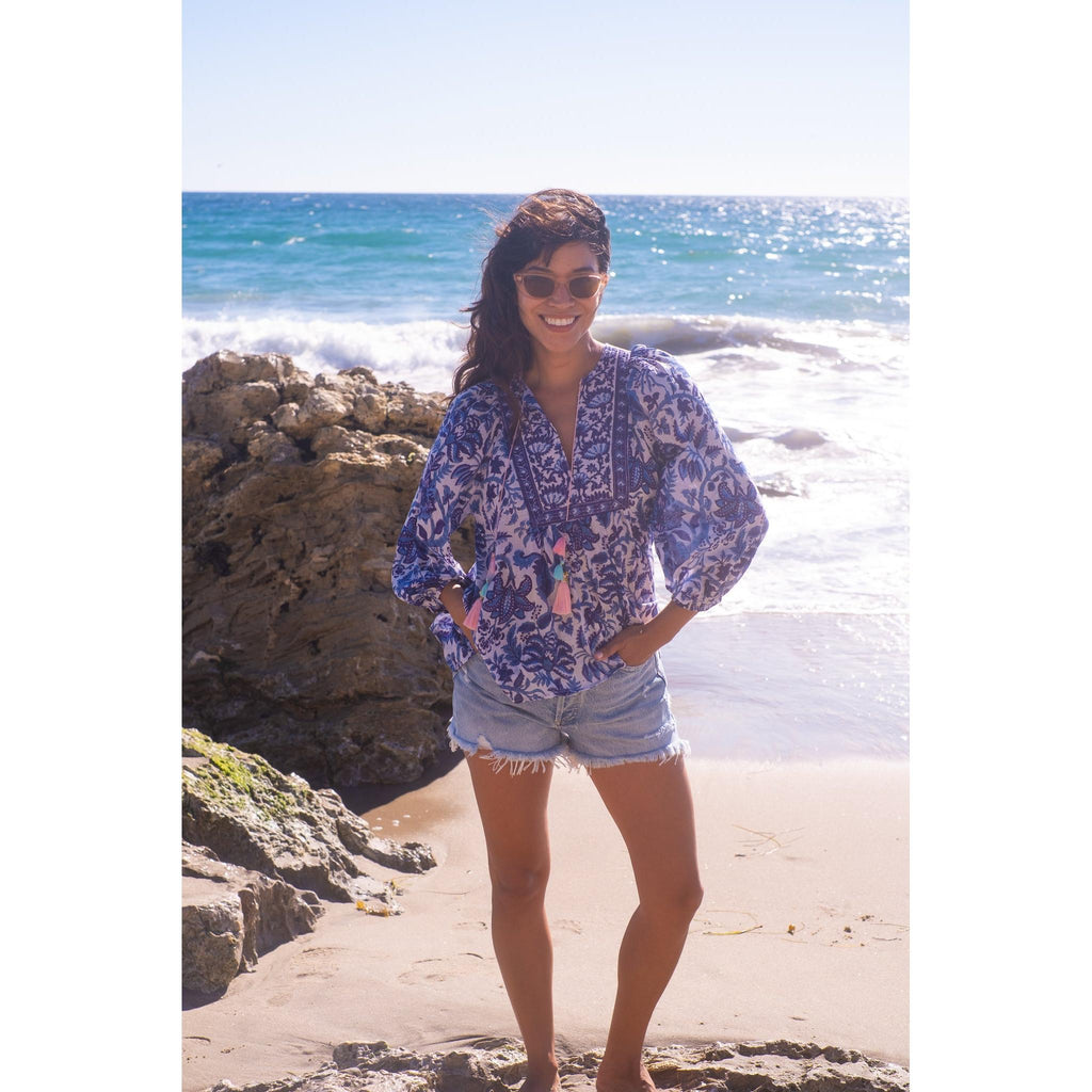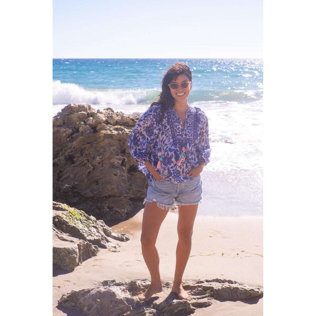 Macey Top $265.00 size S XS S M L XL XS S M L XL Add to Cart This item is a recurring or deferred purchase. By continuing, I agree to the cancellation policy and authorize you to charge my payment method at the prices, frequency and dates listed on this page until my order is fulfilled or I cancel, if permitted. A buttery soft rayon tencel fabric printed long sleeve top with tassel tie neckline