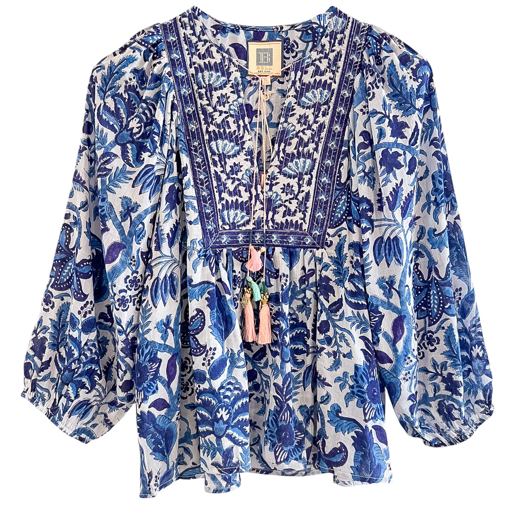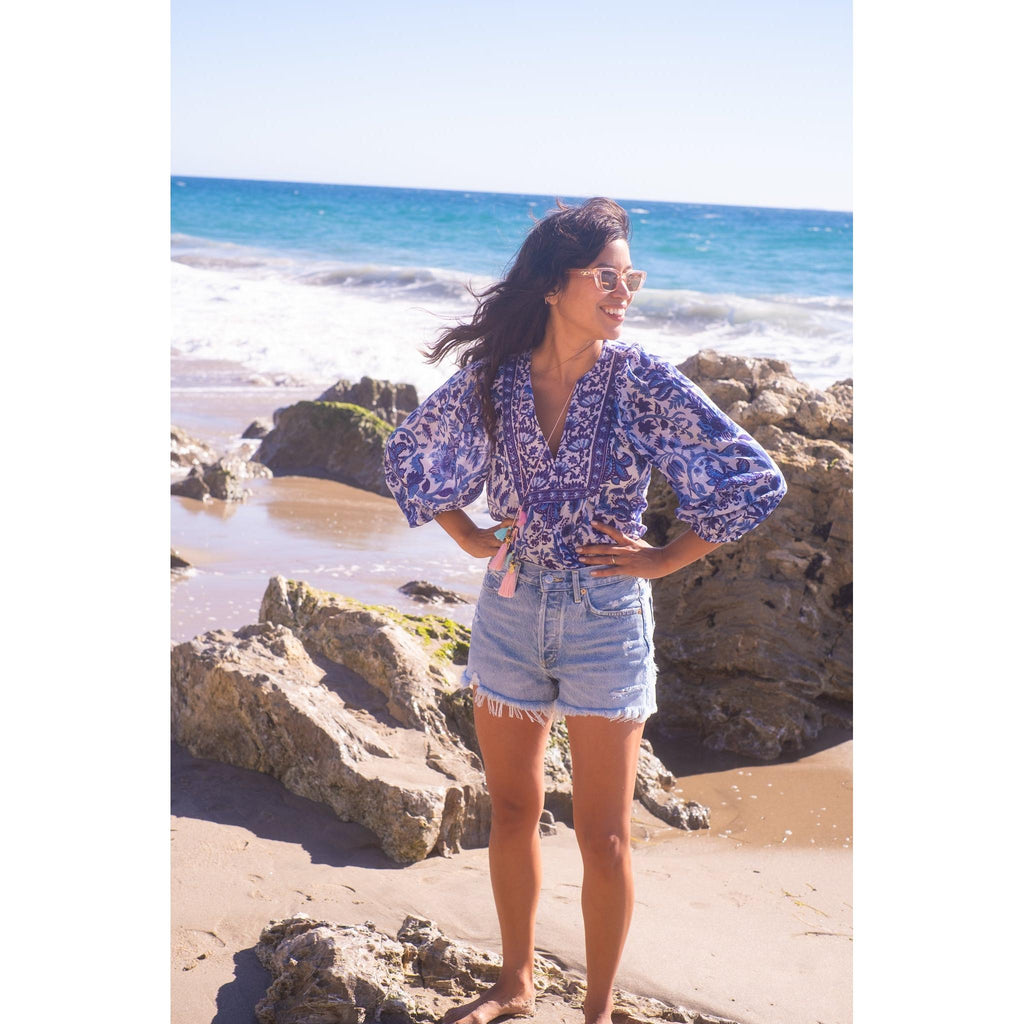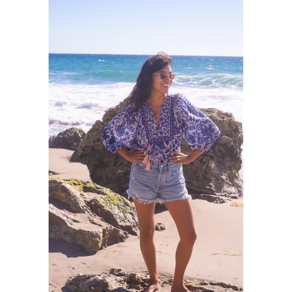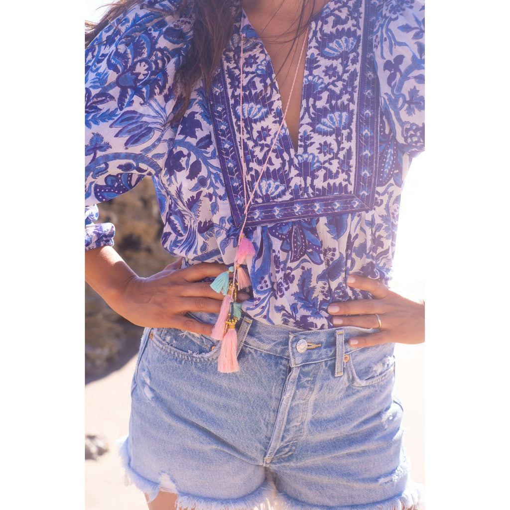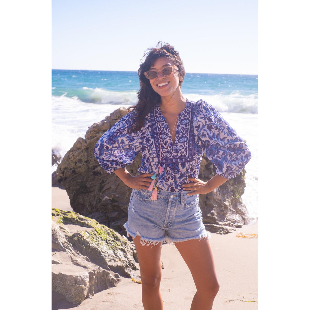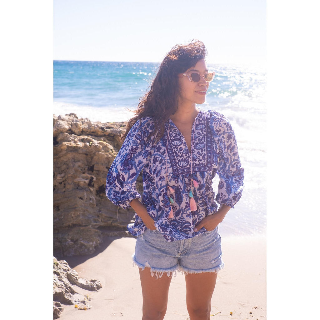 Macey Top $265.00 size S XS S M L XL XS S M L XL Add to Cart This item is a recurring or deferred purchase. By continuing, I agree to the cancellation policy and authorize you to charge my payment method at the prices, frequency and dates listed on this page until my order is fulfilled or I cancel, if permitted. A buttery soft rayon tencel fabric printed long sleeve top with tassel tie neckline